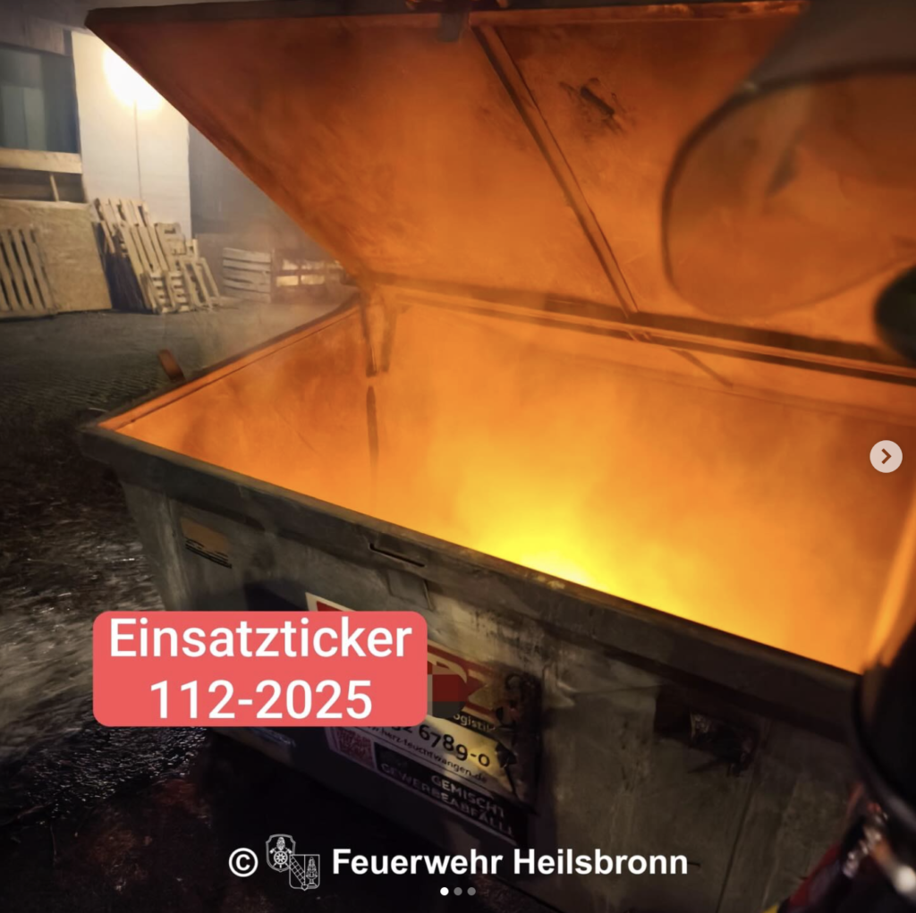 Brand Müllcontainer – während des Weihnachtsmarkts wurden wir am Freitagabend, 05.12.2025 um 20:31 Uhr zusammen mit der Feuerwehr Weiterndorf zu einem brennenden Müllcontainer auf dem Gelände eines Gewerbebetriebs im östlichen Heilsbronner Stadtgebiet alarmiert.
