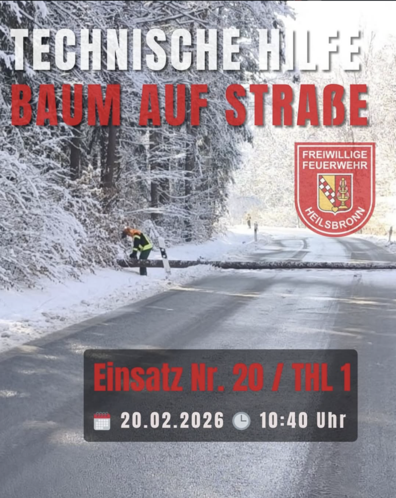Baum auf Straße – Aufgrund der winterlichen Verhältnisse wurden wir am 20.02.2026 um 10:40 Uhr in die Verlängerung der Neuendettelsauer Straße Richtung Staatsstraße alarmiert. Dort sollten mehrere Bäume aufgrund der Schneelast in die Fahrbahn ragen und eine Verkehrsgefährdung darstellen.