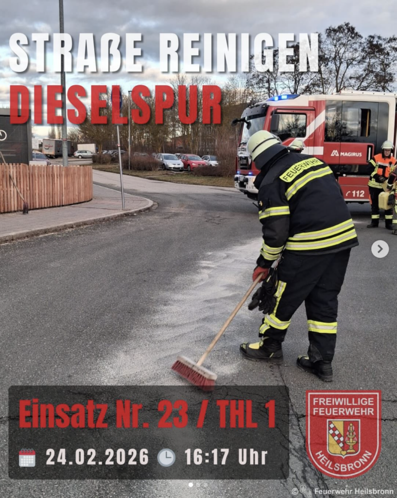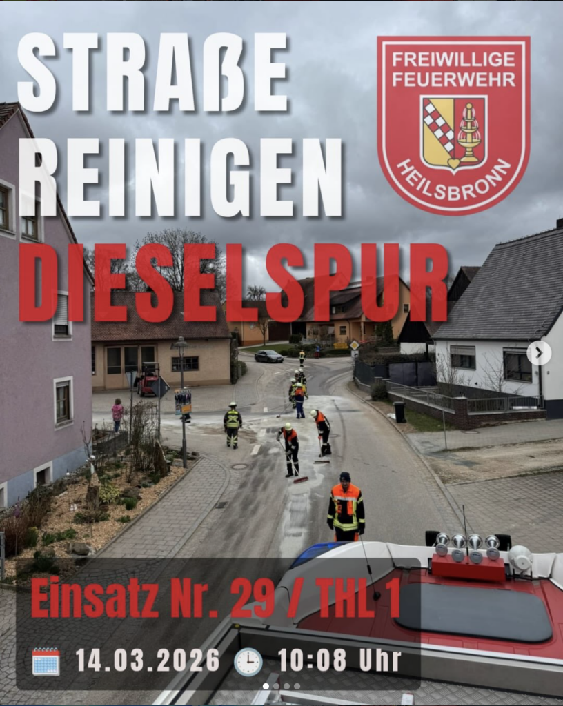 Straße reinigen – am 24.02.2026 alarmierte uns die Leitstelle zu einer ausgedehnten Dieselspur im gesamten Heilsbronner Stadtgebiet. Vermutlich hatte ein Linienbus Kraftstoff verloren.