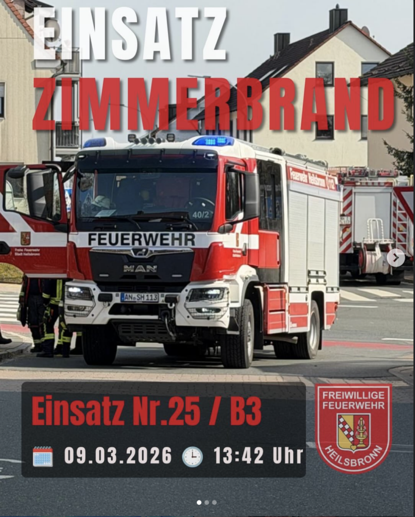 Zimmerbrand – am Montag, 09.03.2026 wurden wir zusammen mit der Feuerwehr Weiterndorf zu einem Zimmerbrand, Rauchentwicklung im Gebäude um 13:42 Uhr ins östliche Heilsbronner Stadtgebiet alarmiert.